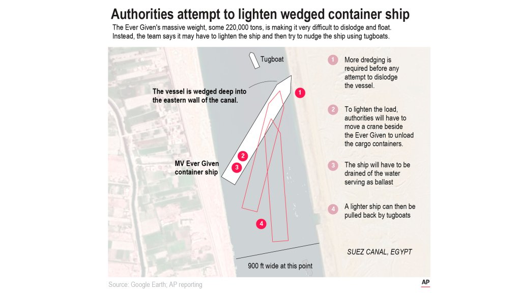 The partial freeing of the vessel came after intensive efforts to push and pull the vessel with 10 tugboats when the full moon brought spring tide, raising the canal’s water level and hopes for a breakthrough. However, it was clear that challenges remained, as satellite data from MarineTraffic.com showed the ship in the same position, surrounded by a squadron of tugs with its bulbous bow stuck in the canal’s eastern bank. A top pilot with the canal authority, speaking on condition of anonymity, confirmed that the ship had been partially refloated and said that workers were still struggling to dislodge the bow.