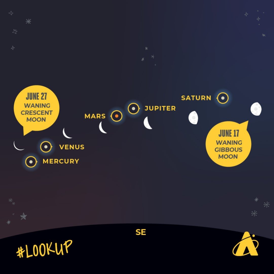 The planetary alignment will continue through June 30. Venus and Jupiter will be the brightest and easiest to see.