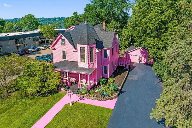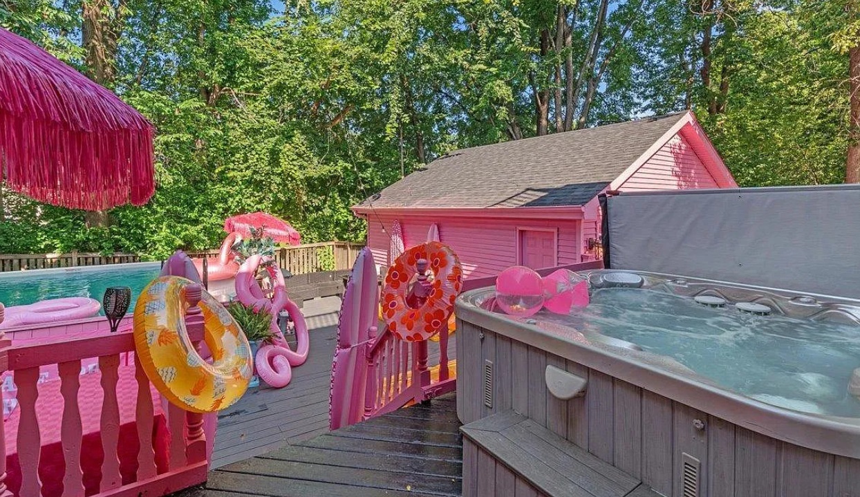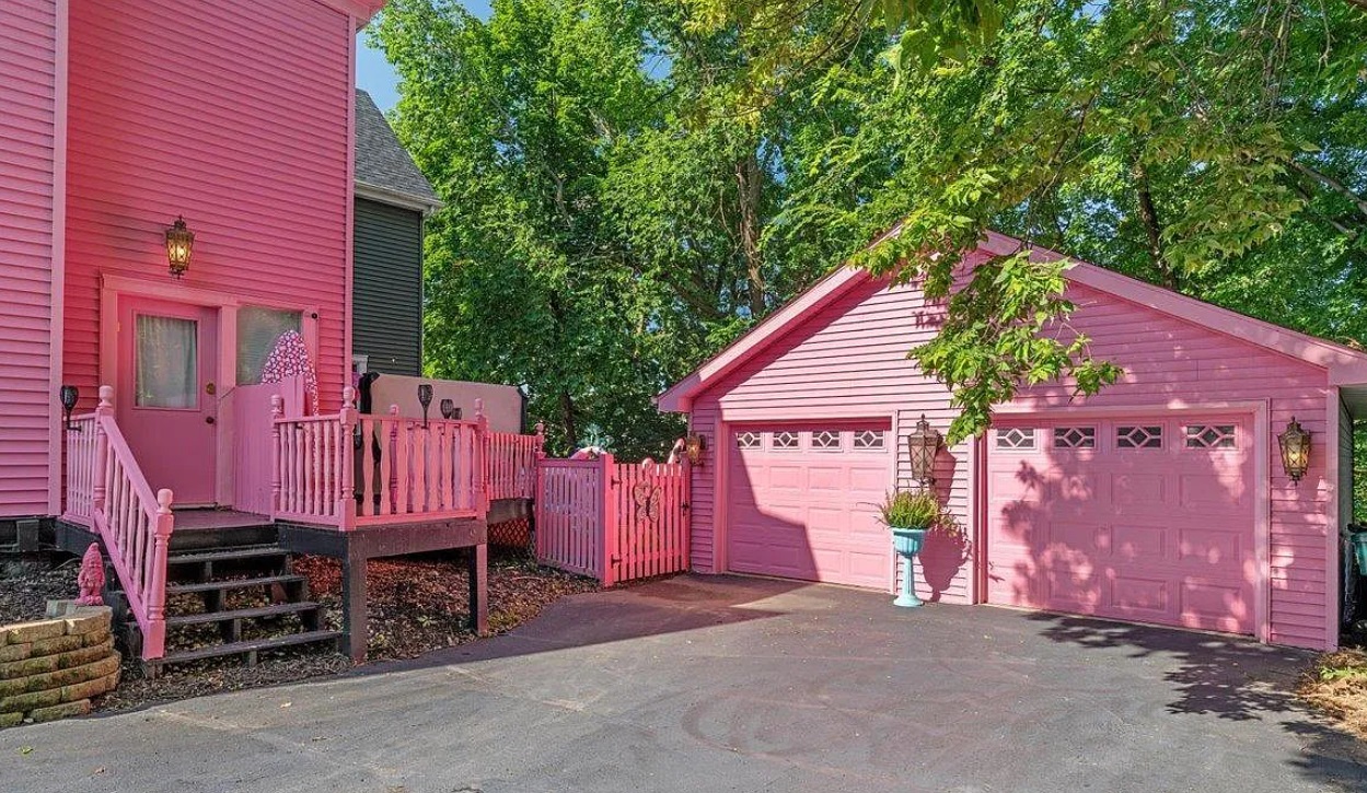 The 5,189-square-foot “pink palace” on the market in Hudson, Wisconsin, for $1.1 million boasts an all-pink facade, pink staircases, many pink walls, a movie room and a hot tub and pool in the backyard.