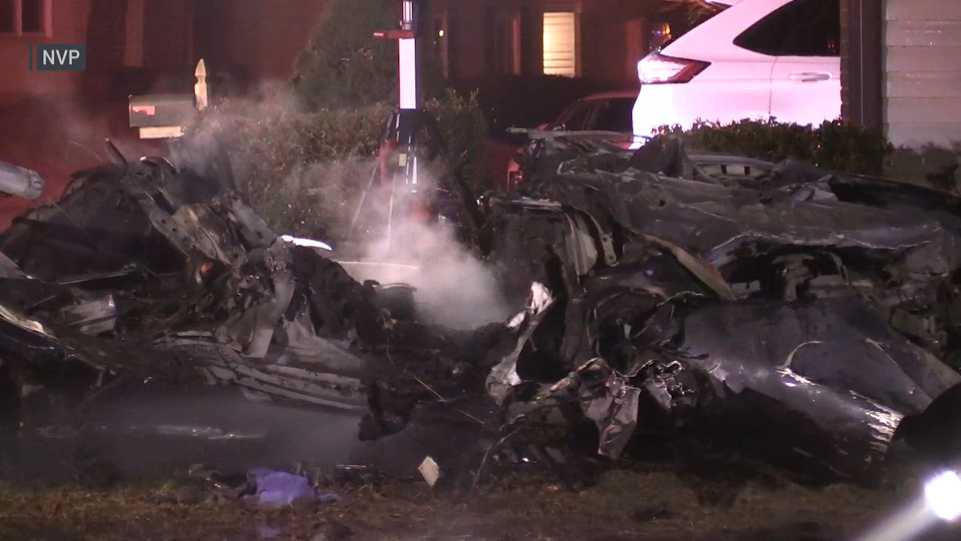 Two people were killed when an electric car in southwest suburban Woodridge sped down a residential street, crashed into a home and then burst into flames, with shocking video capturing some of the incident on camera.