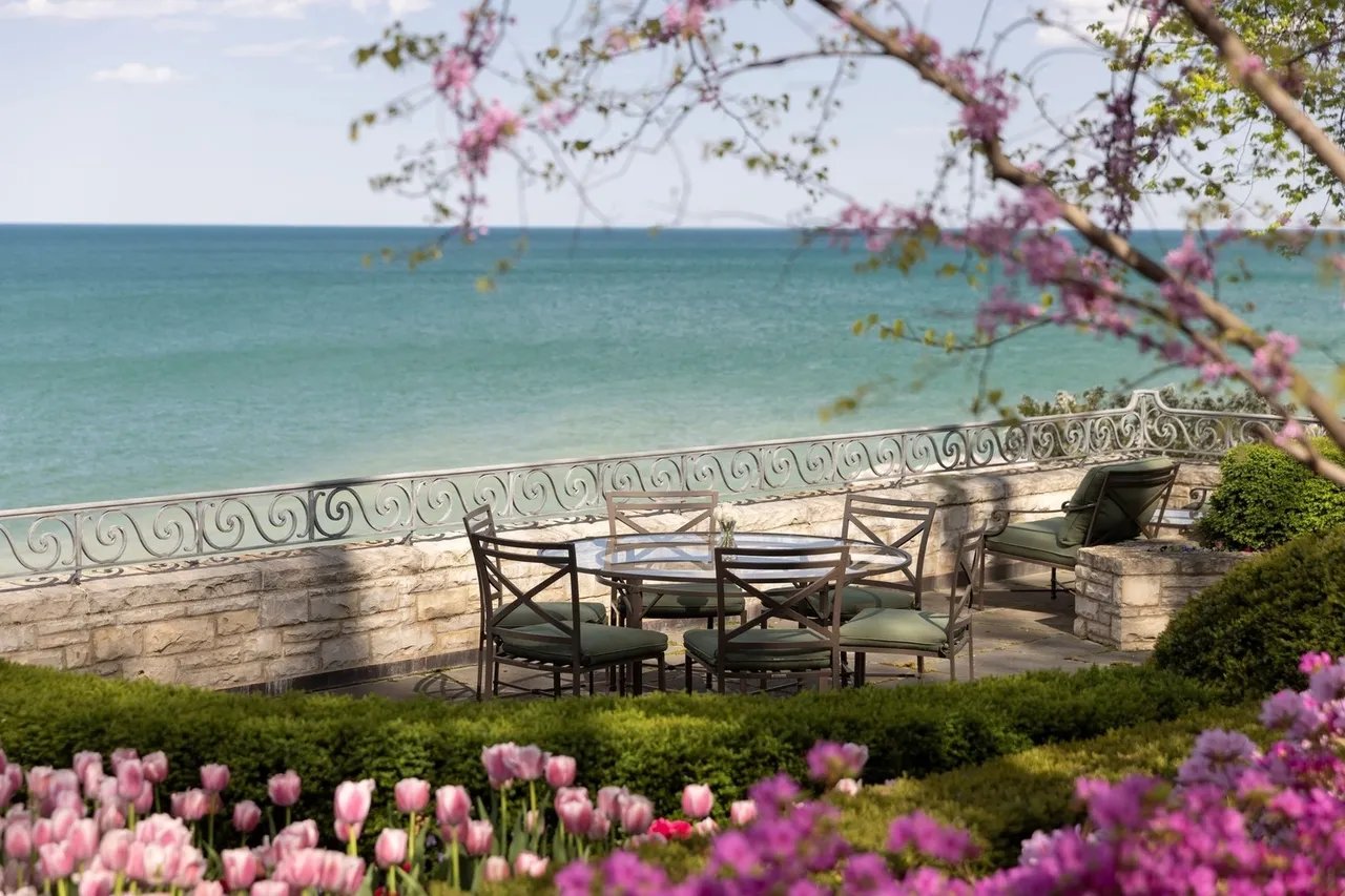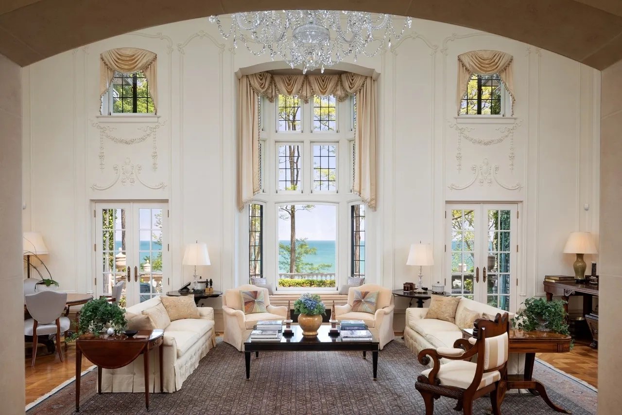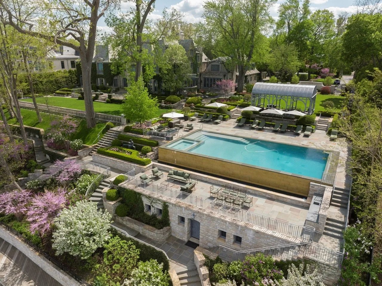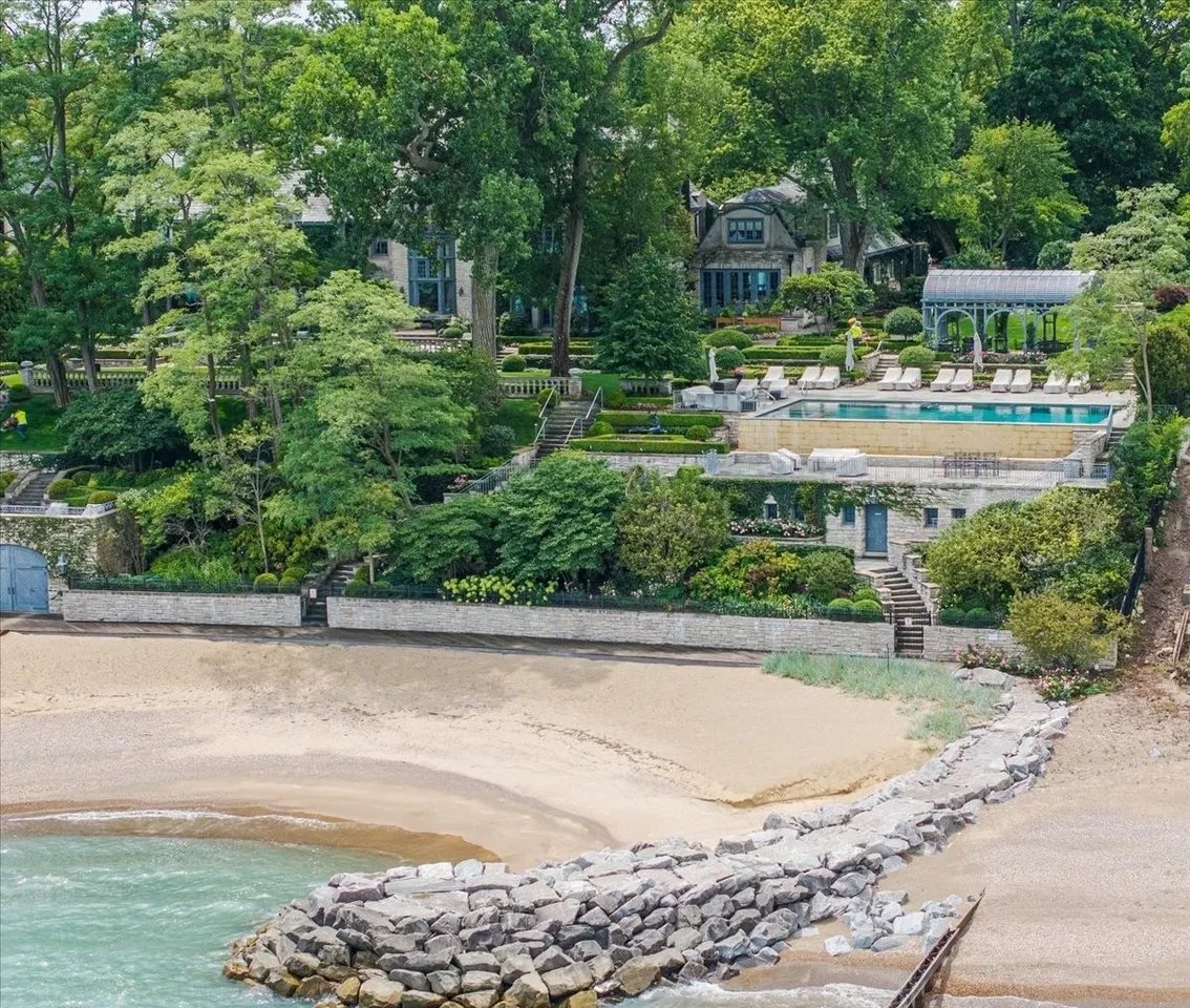 “The ‘Windsor House’ has been elevated to a new grandeur of living with a best in class collaboration lead by nationally recognized interior design, landscape architects & coastal engineering teams,” the listing read. “Gloriously expanded to 2.3 acres with the purchase of 429 Sheridan transformed into a commercial level botanical garden with a Lannon stone custom fountain, manicured hedges & grassy lawn, heated motor court for 10 cars, & meticulously engineered nailess pergola overlooking the infinity pool area with panoramic lake views. The only home on the entire shoreline that is reminiscent of 5-star boutique level European hotel delivering a true vacation living experiences 365 days a year.”