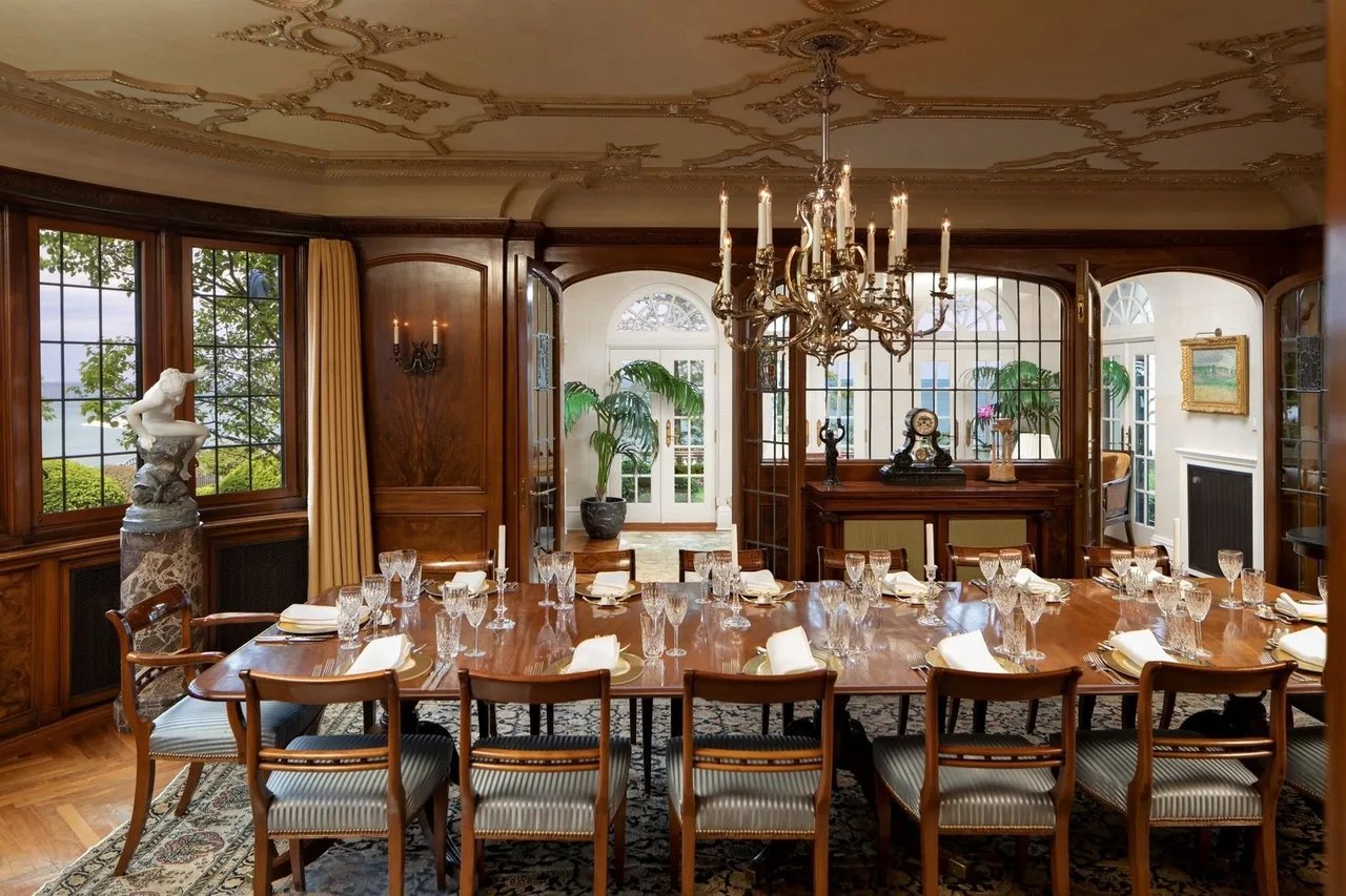 The 22-room mansion was designed with French inspiration and includes 223 feet of private beachfront property that includes a boathouse and commercial-level boardwalk.