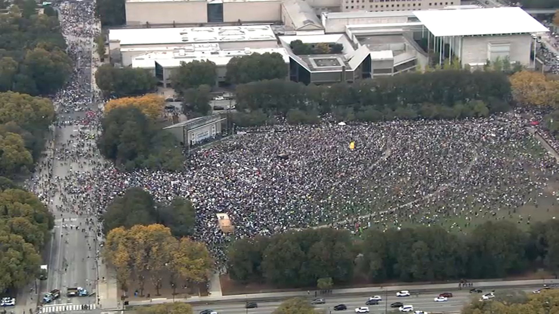 Footage captured by NBC’s Sky 5 helicopter showed thousands gathered at Grant Park as a protest began at around noon.
