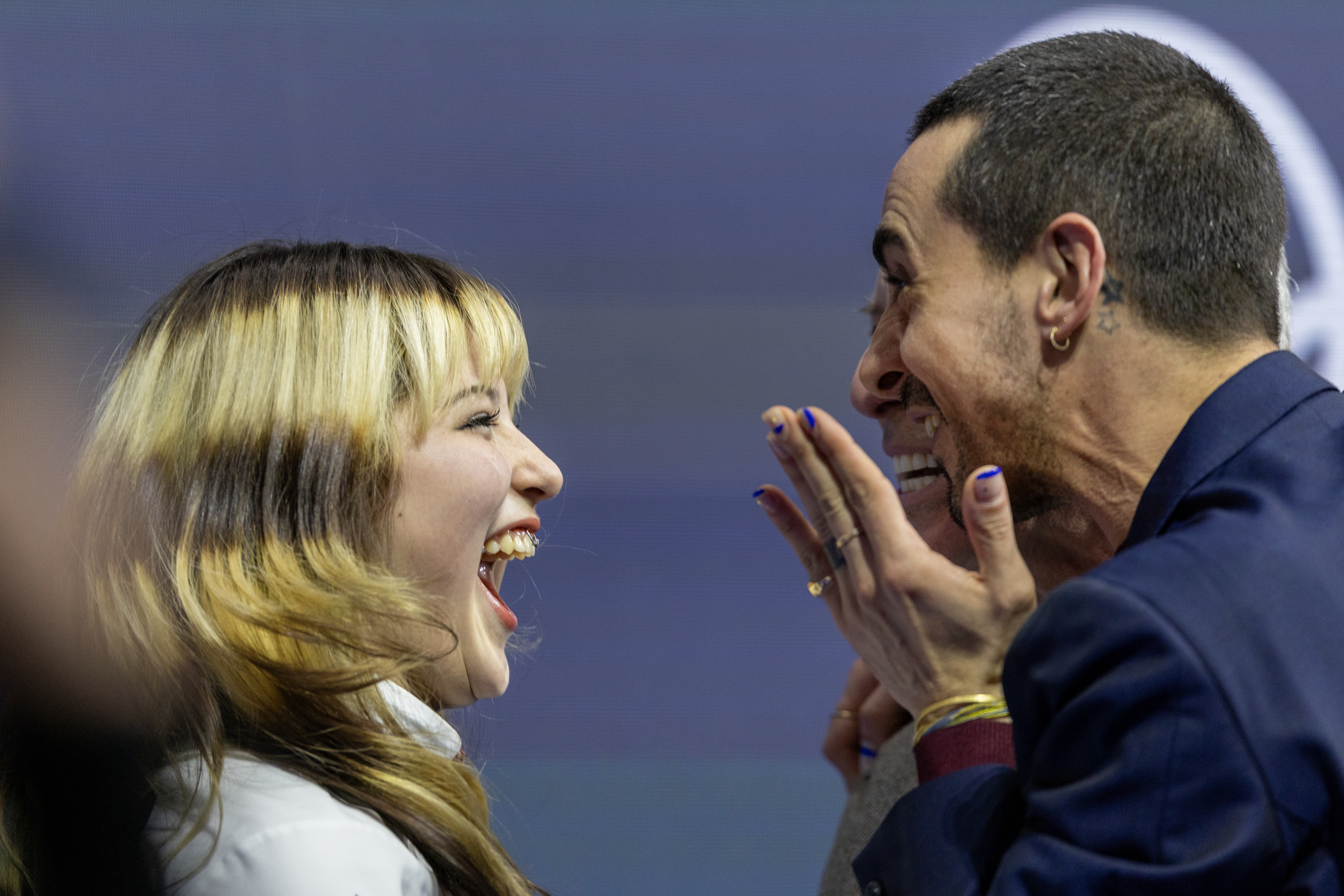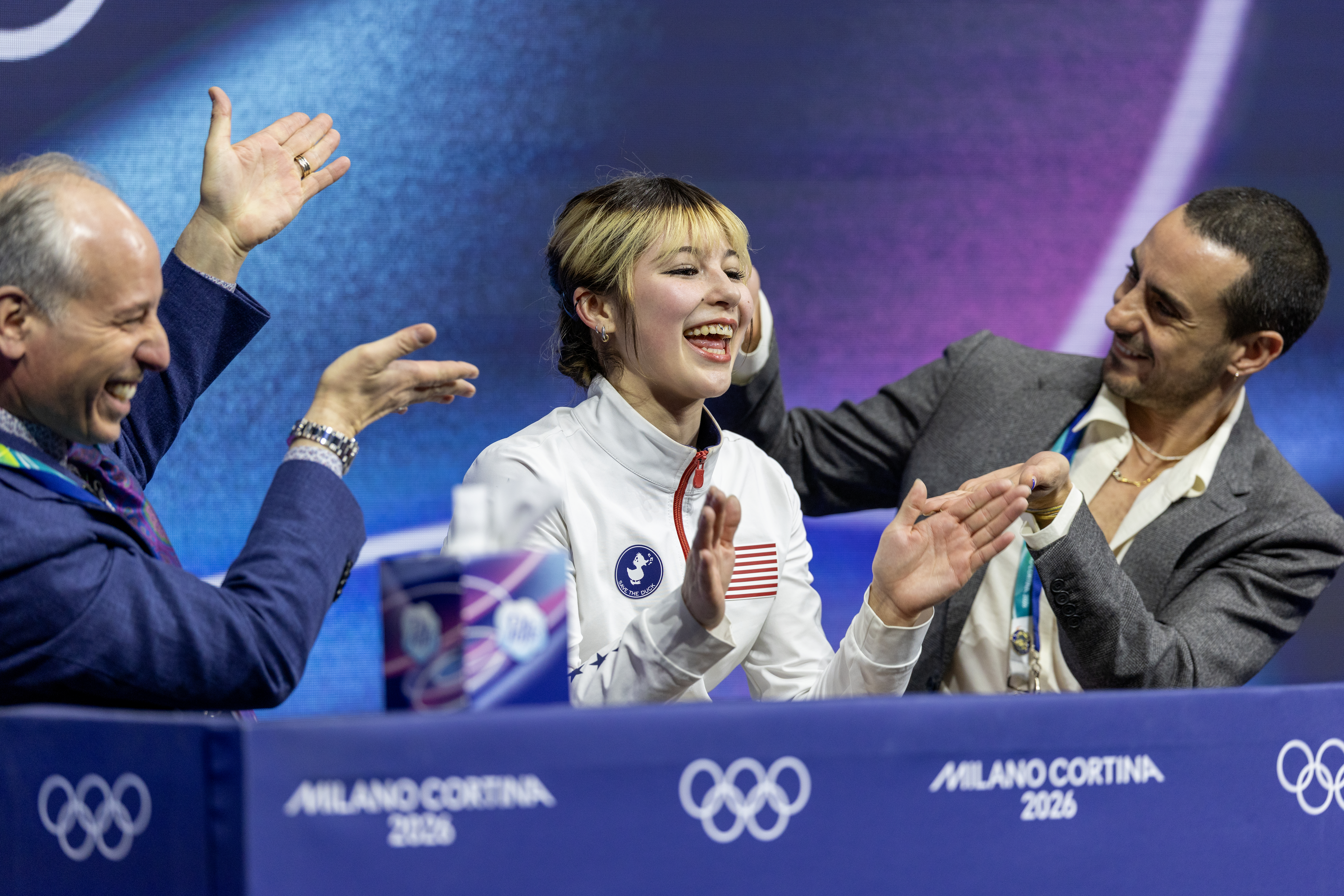 MILAN, ITALY – February 17: Alysa Liu of the United States with coaches Phillip DiGuglielmo and Massimo Scali awaiting her score after performing her routine during the Figure Skating, Women’s Singles Skating, Short Program at the Milano Ice Skating Arena at the Milano Cortina Winter Olympic Games 2026 on February 17th, 2026 in Milan, Italy. (Photo by Tim Clayton/Getty Images)
