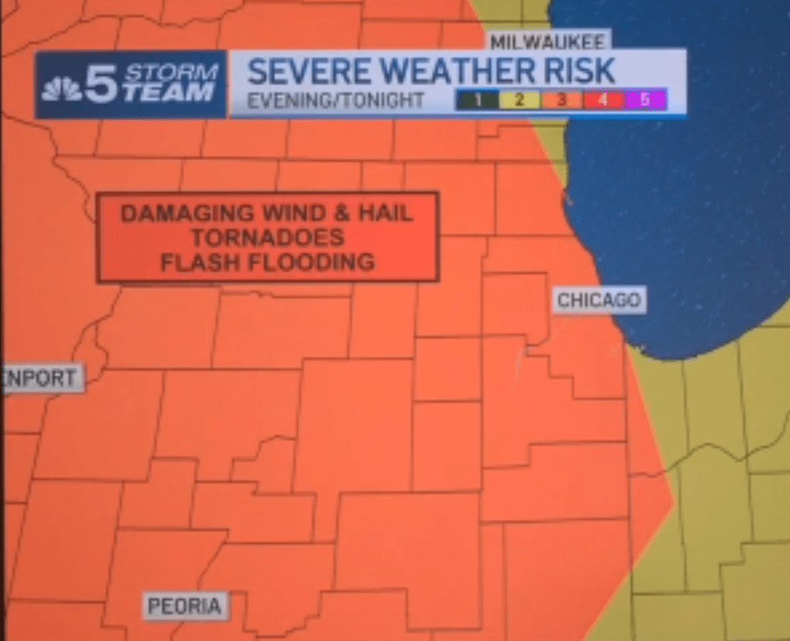 According to the Storm Prediction Center, nearly the entire Chicago area is under an “enhanced” risk of severe weather Friday night, which ranks as level three of five.